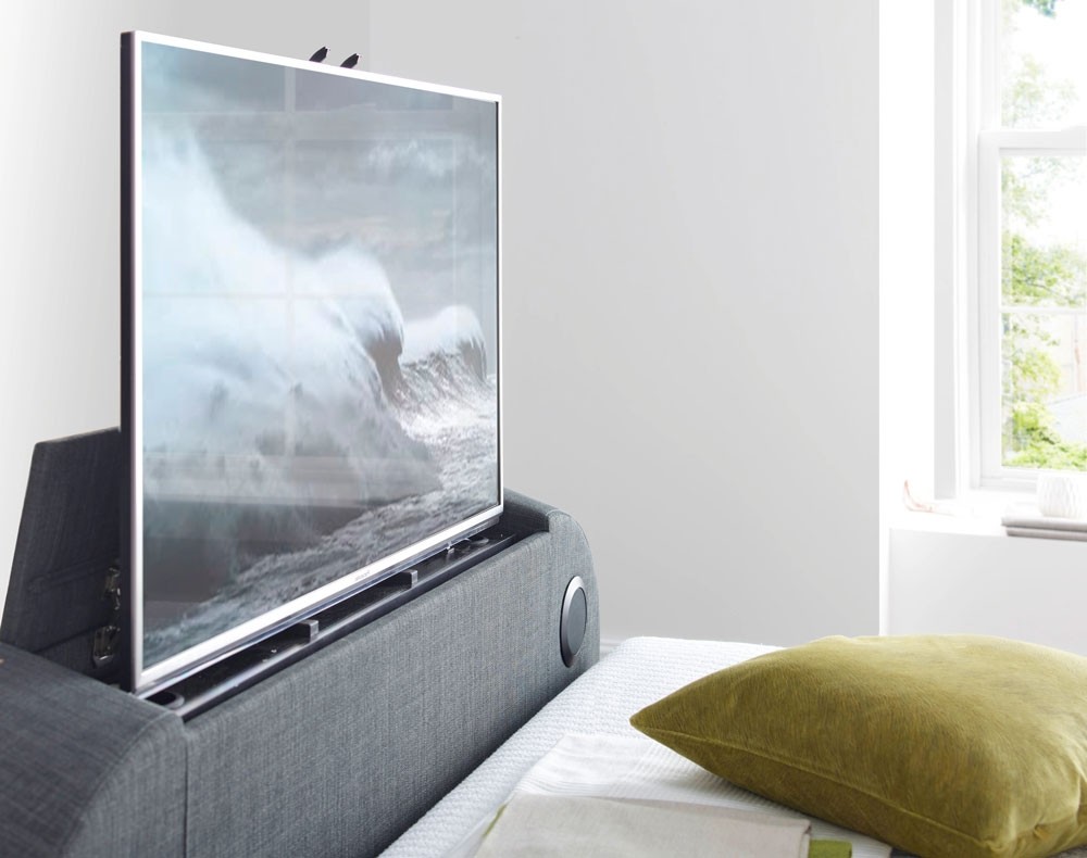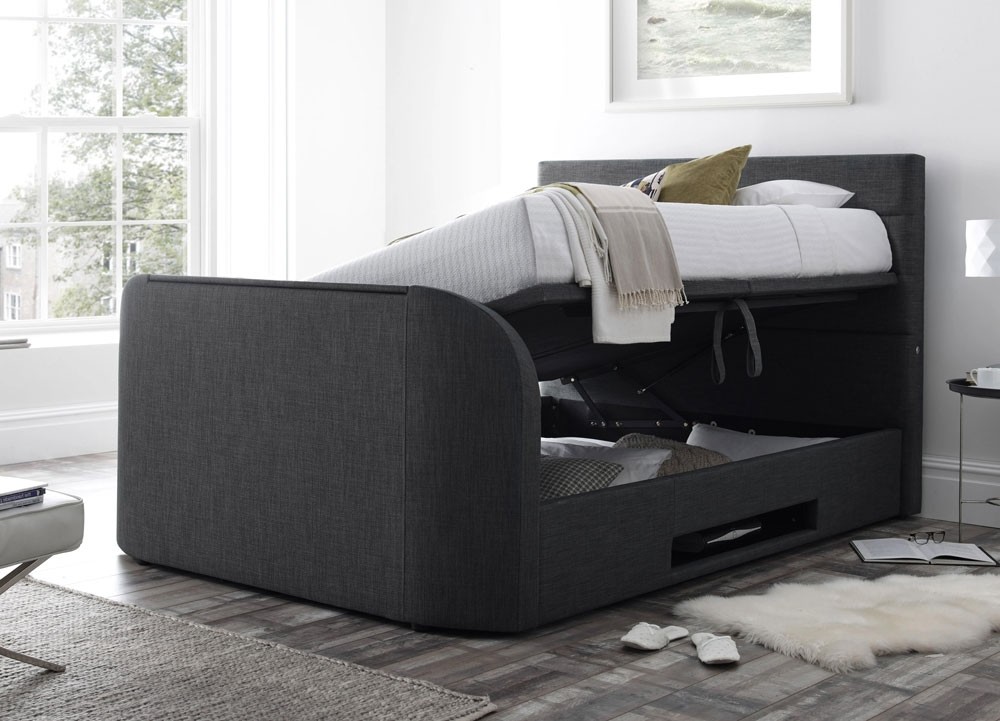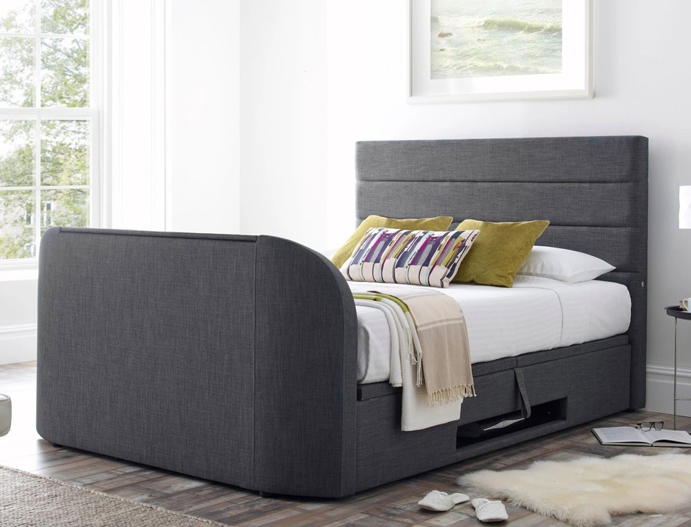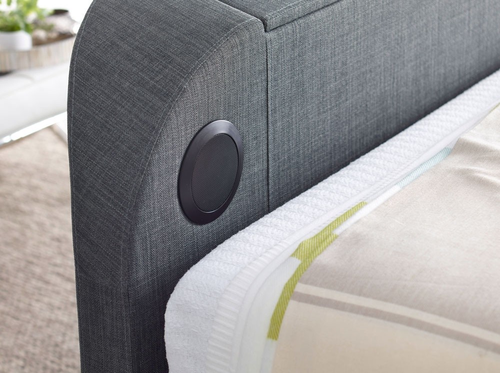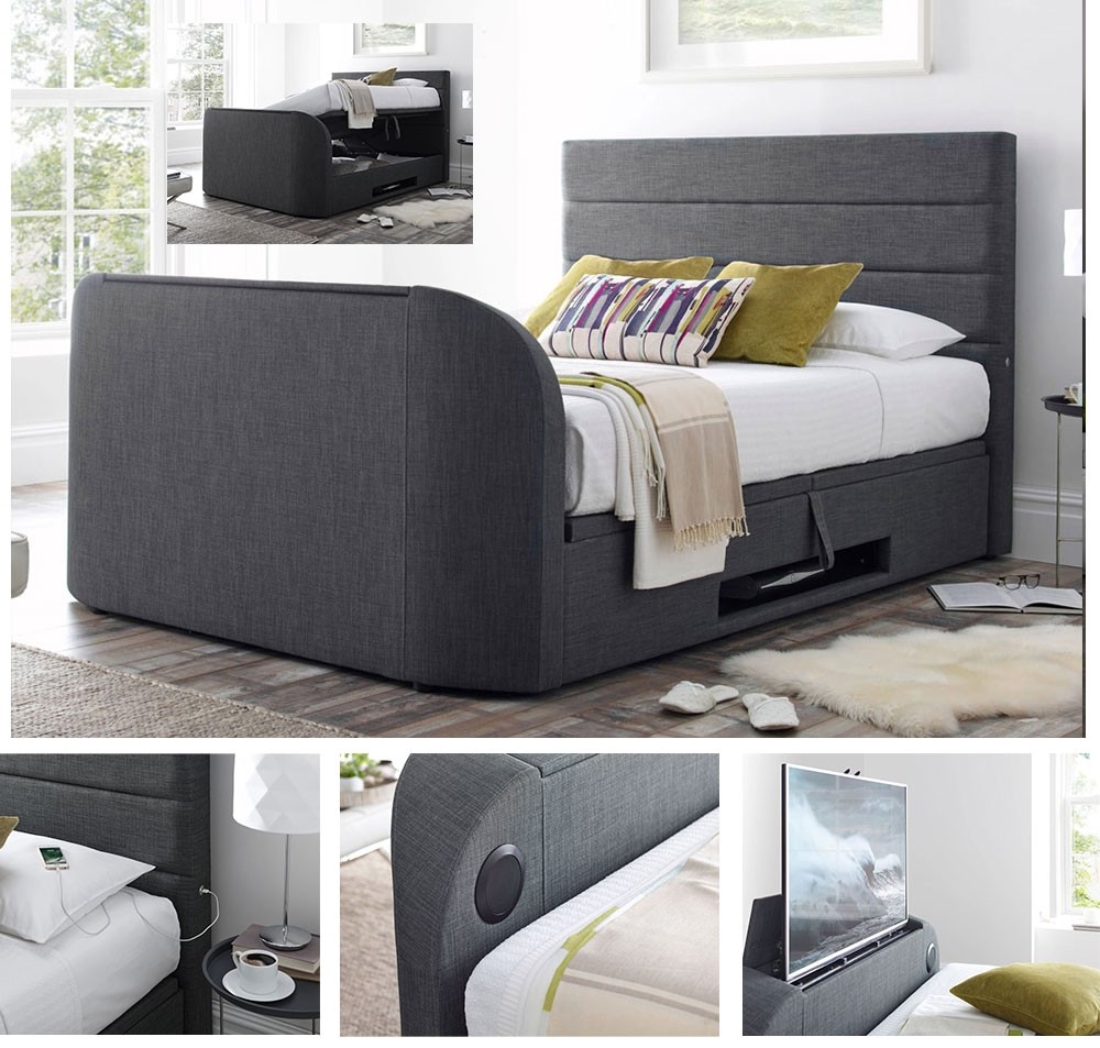Modern and contemporary design, fantastic tech, king size, remote control TV and multi media bed frame with lift up ottoman storage, all finished in a stylish grey hopsack fabric. Built in 2.1 surround sound speakers, built in sub-woofer, USB chargers and Bluetooth connectivity create an amazing multi media TV bed. Gas lift ottoman storage base completes a fantastic bed for todays lifestyle. FREE Delivery.