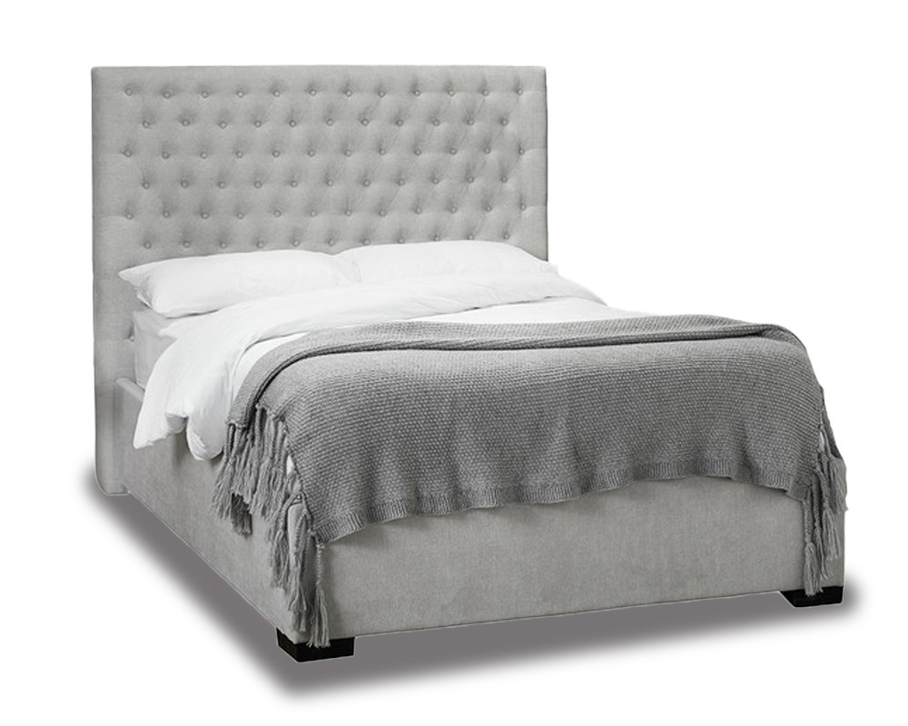 Richly upholstered, tall double bed frame with a deep side rail for an elegant look. High quality silver grey fabric with dark wood feet. FREE Express Delivery.