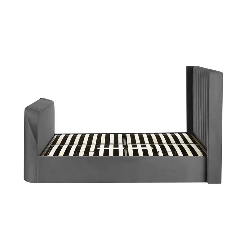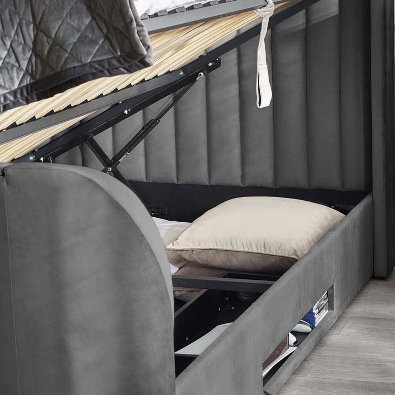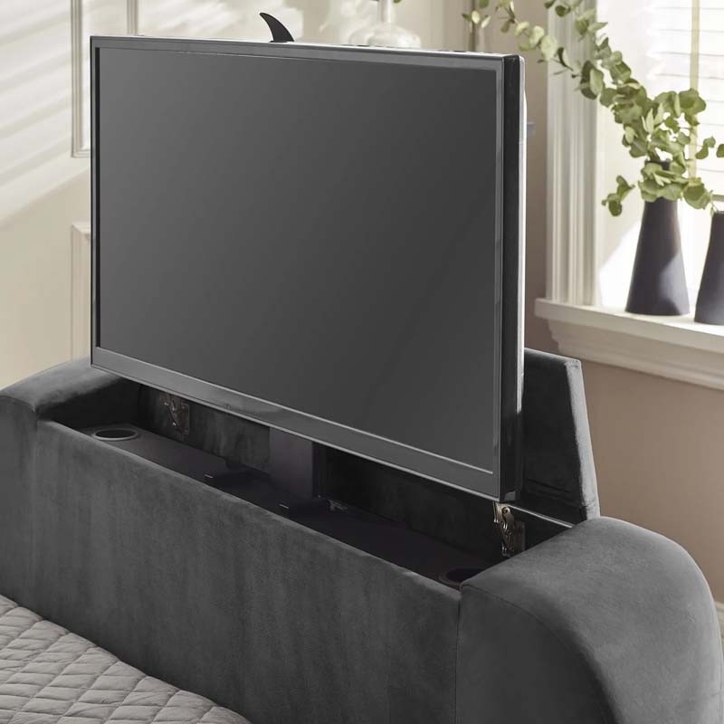 Stunning looks and wonderfully functional winged, double size, TV bed frame with gas lift ottoman storage. Get so much more from your bedroom with this dark grey plush velvet, winged design ottoman storage bed frame incorporating a remote controlled rise and fall TV bracket hidden within the footend (Max 43" TV). FREE Delivery.