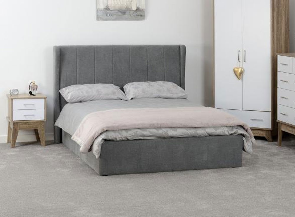 Dark grey fabric boutique hotel style king size bed frame with an ottoman storage base. A high backed, winged headboard will give style and character to your bedroom with a really useful lift up storage area. FREE Delivery.