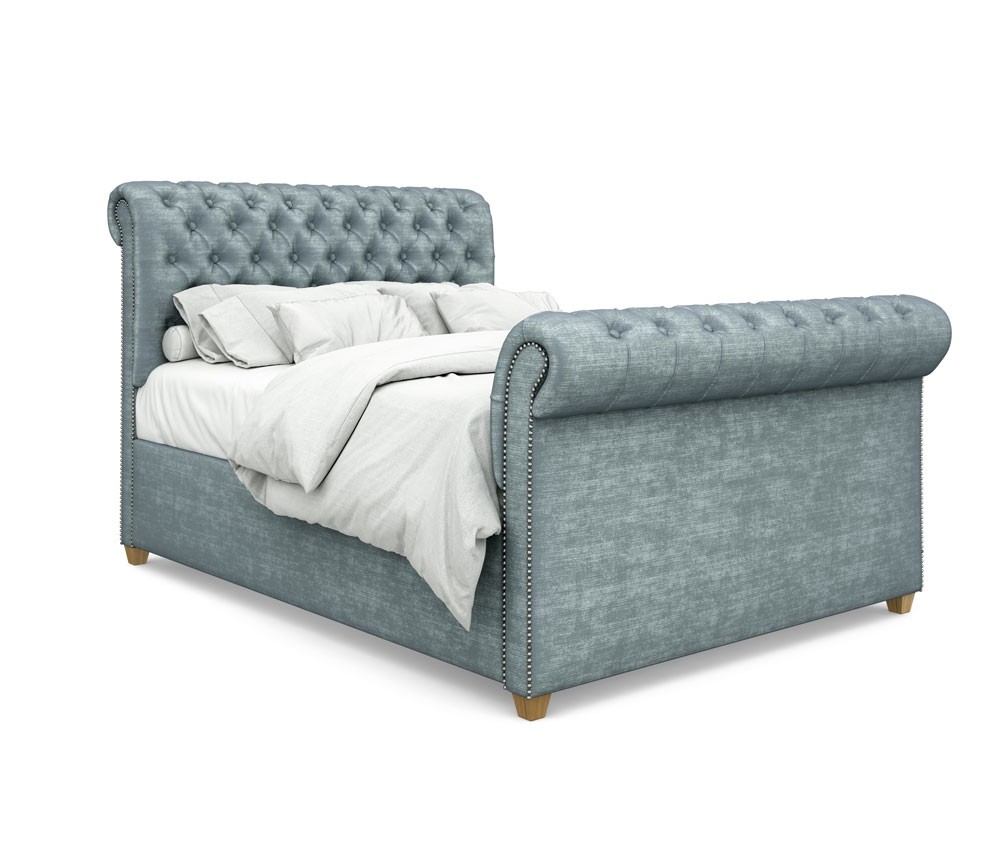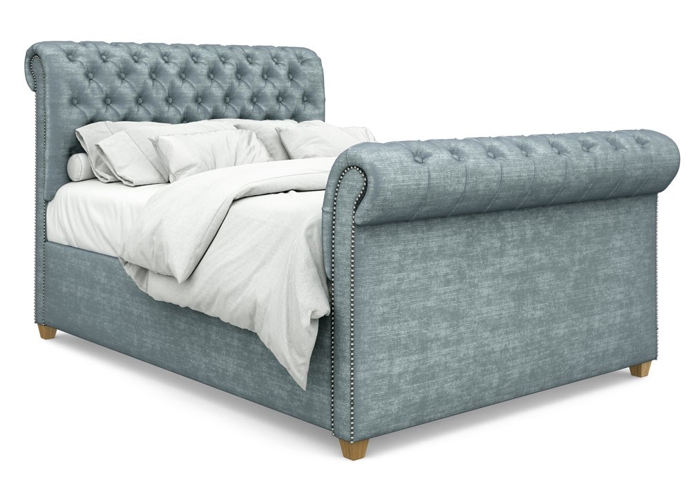 Timeless and classic king size bed frame in a chesterfield design. Upholstery studs and a fantastic choice of fabrics add a contemporary twist. Created and built in the UK. Free Delivery.