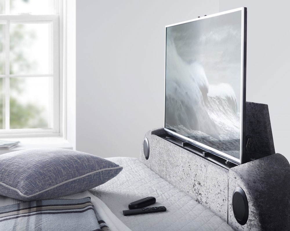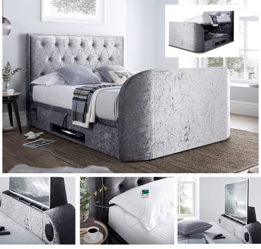 Deep, buttoned and stylish design, great tech, super king size, remote control TV and multi media bed frame with lift up ottoman storage, all finished in a beautiful crushed silver fabric. Built in surround sound speakers, USB chargers and Bluetooth connectivity make this so much more than just a TV bed. Gas lift ottoman storage base completes an amazing bed for todays lifestyle. FREE Delivery. NEXT BATCH DATE NOT YET CONFIRMED. APPROX MARCH 2025