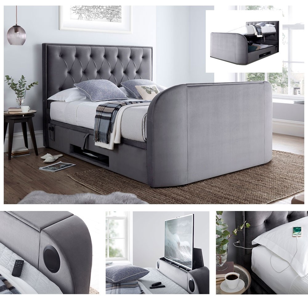 Deep, buttoned and stylish design, great tech, double size remote control TV and multi media bed frame with lift up ottoman storage, all finished in a plush velvet grey fabric. Built in surround sound speakers, USB chargers and Bluetooth connectivity make this so much more than just a TV bed. Gas lift ottoman storage base completes an amazing bed for todays lifestyle. FREE Delivery. OUT OF STOCK UNTIL APPROX MARCH 2025