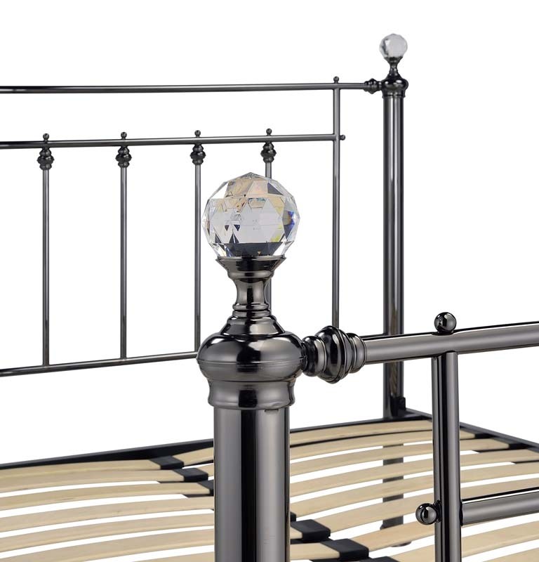 Vintage double bed frame design in a high quality, modern black chrome finish. Supplied with both metal and glass finials to subtly change the look. FREE Express Delivery.