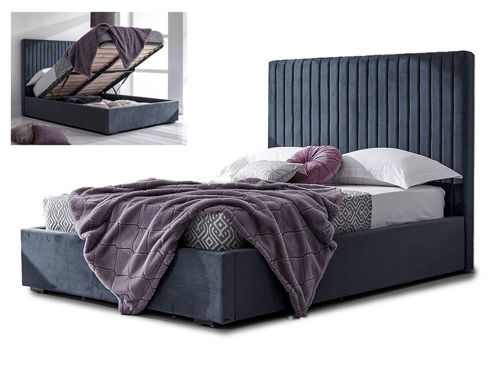 Contemporary, high backed king size storage bed frame in a plush velvet, steel grey/blue colour fabric. Super handy easy end lift ottoman storage base. FREE Delivery.
