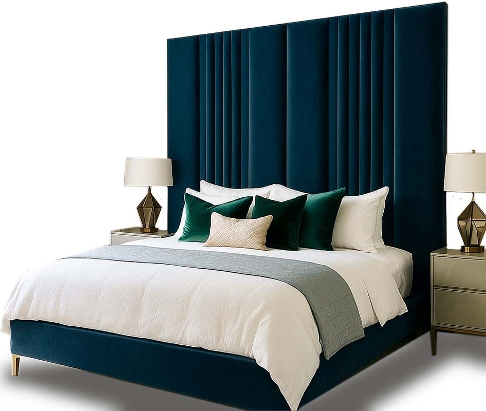 Rule the room with this luxury, bespoke super king size bed frame. Contemporary and bold opulent bed frame design with a classic chrome leg that will truly set the tone for your bedroom design. Personalise to your height, colour and base type for a striking, impactful look. Hand made to your order.