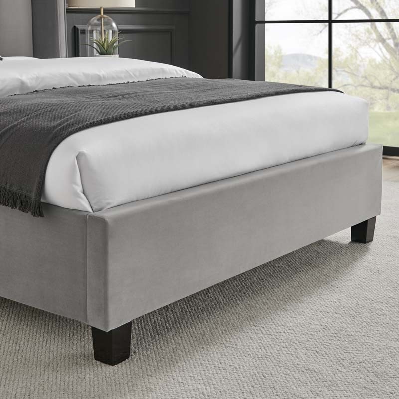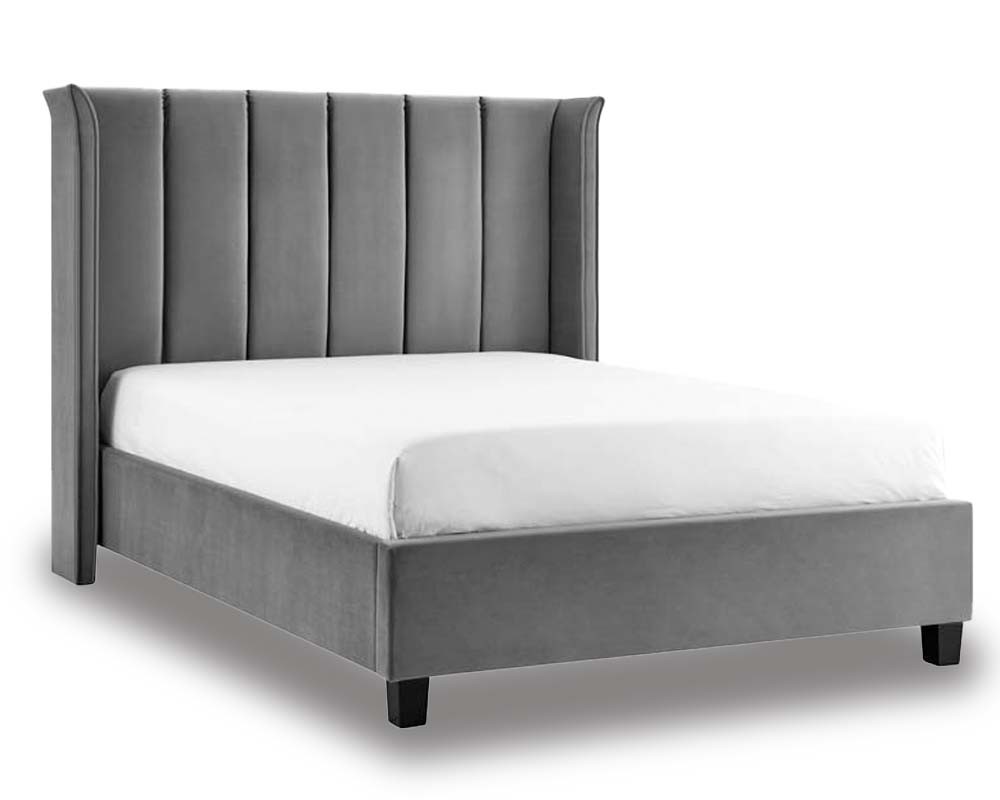 Classic, winged, king size bed frame with dark wood shaped feet. Finished in a popular silver grey cover made from 100% recycled low carbon fabric. FREE Express Delivery.
