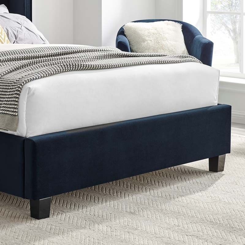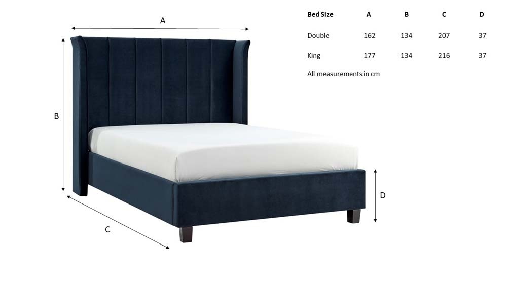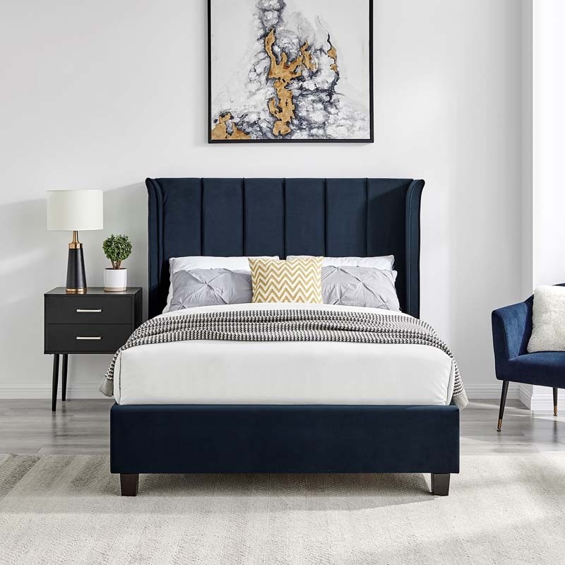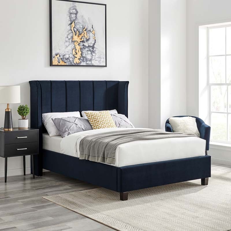Impressive and sustainable winged double bed frame design in a striking navy blue colour fabric. 100% recycled fabric re-using up to 190 plastic bottles. FREE Express Delivery.
