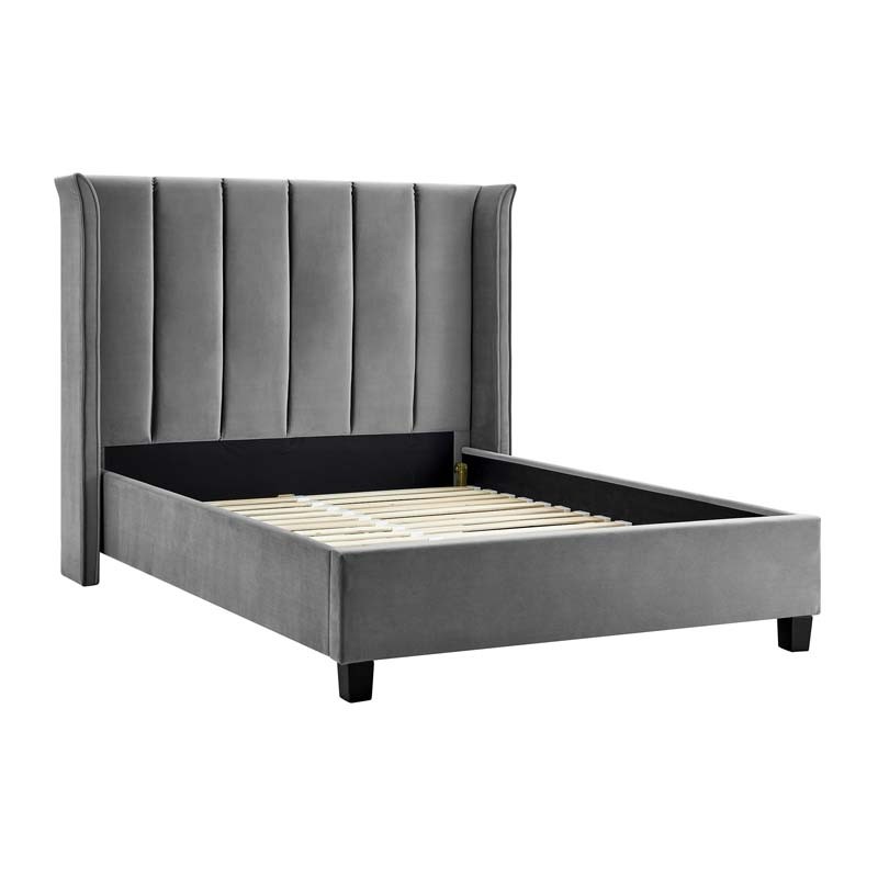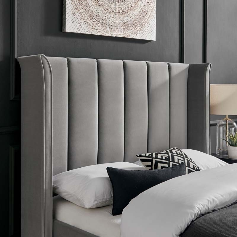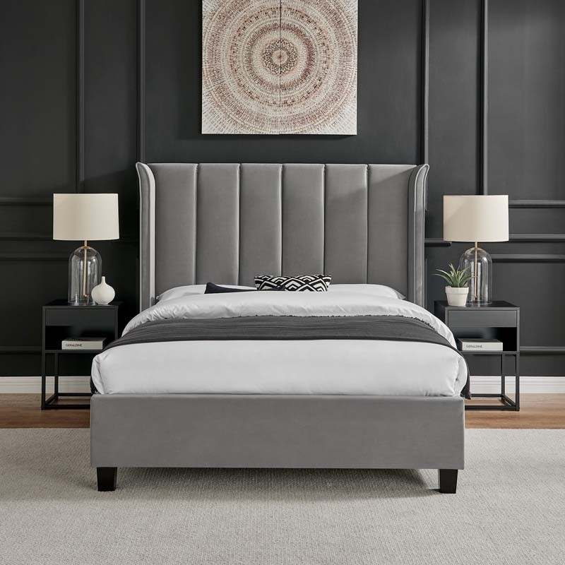 Impressive and sustainable winged double size bed frame design in an opulent silver colour fabric. 100% recycled fabric re-using up to 190 plastic bottles. FREE Express Delivery.