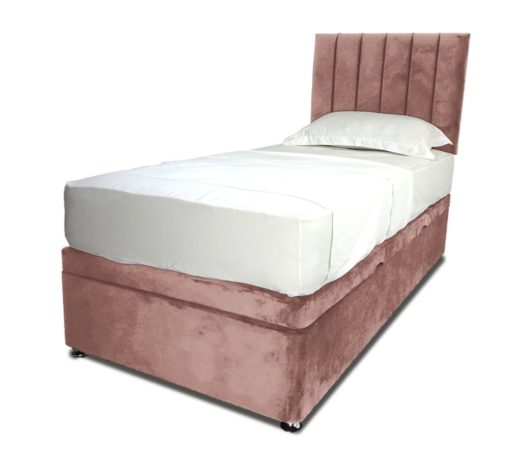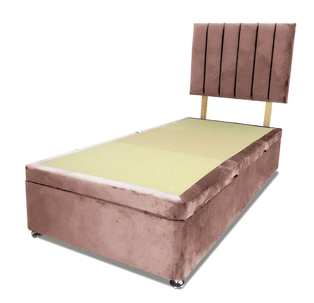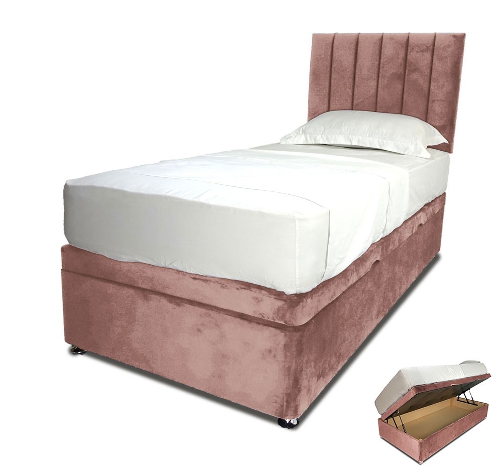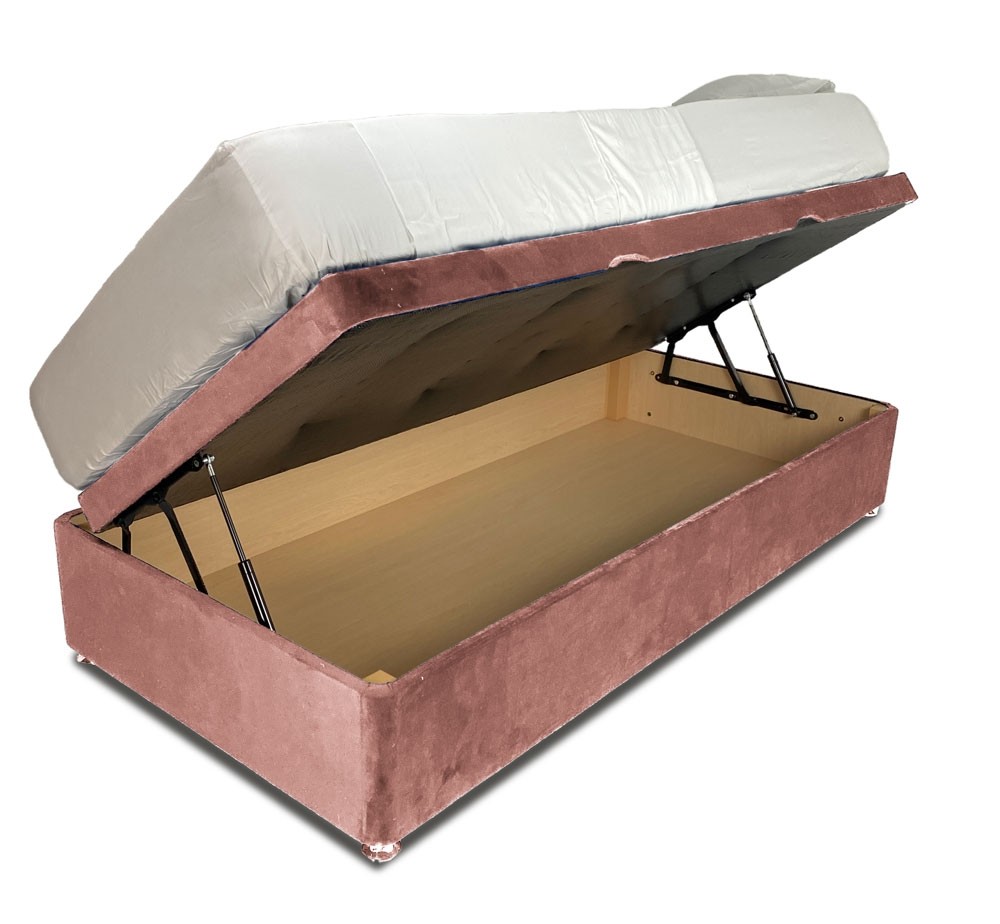 Extra strong and durable single side lift ottoman storage base in a beautiful plush velvet regency rose colour fabric. Complete with matching padded Horizon headboard. Two hydraulic arms give access to a fully lined storage area. Super strong reinforced divan base. FREE Express Delivery.