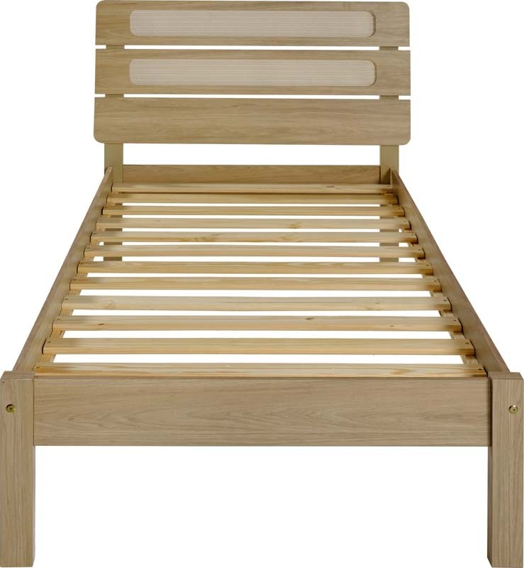 Sturdy oak colour with rattan detail wooden single bed frame. FREE Delivery.