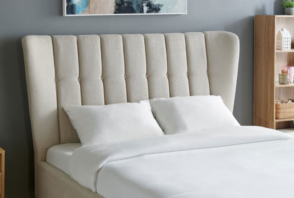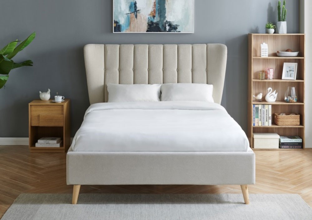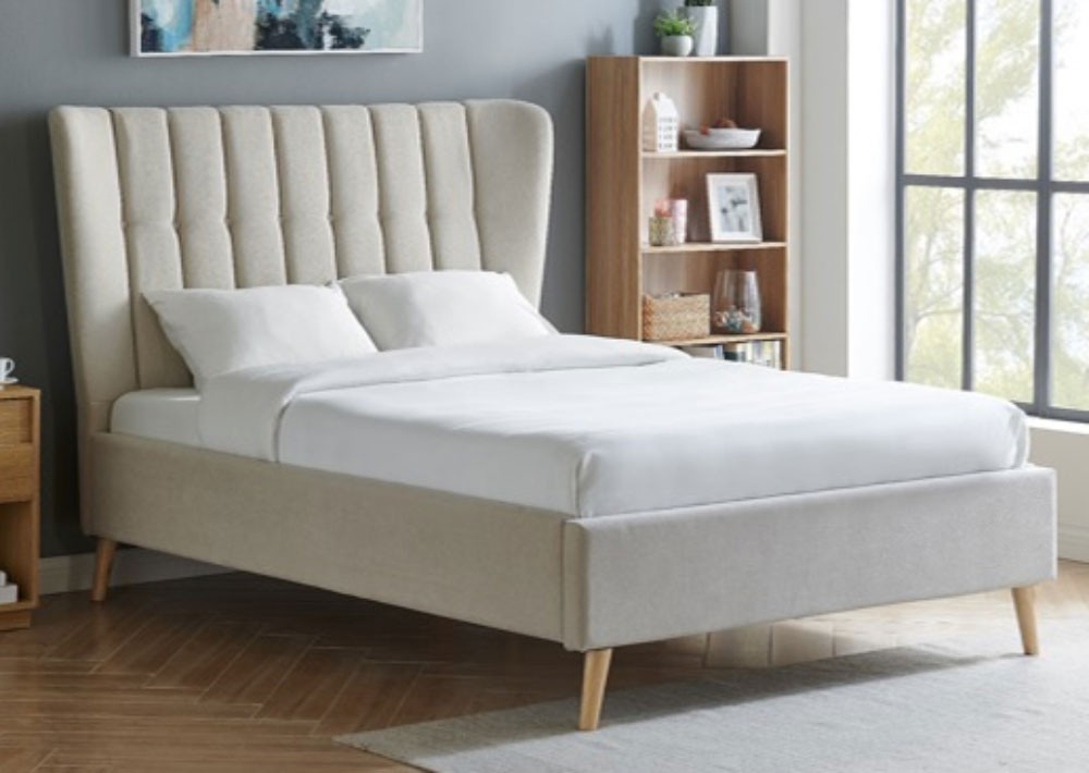 Classy, sophisticated designer double bed frame with a curved, winged head end. Finished in a high quality natural fabric. FREE Express Delivery.